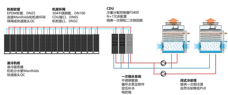 室外一次側液冷循環系統主要包括冷卻塔、水泵、定壓補水裝置、軟化水裝置和純化水裝置等。機房內二次側液冷循環系統主要包括冷卻水分配單元CDU及連接CDU與液冷機柜的不銹鋼管路等。液冷系統充分考慮冗余性,關鍵設備,冷卻塔、水泵、CDU均采取N+1冗余備份的方式,確保液冷系統的長期穩定運行。
